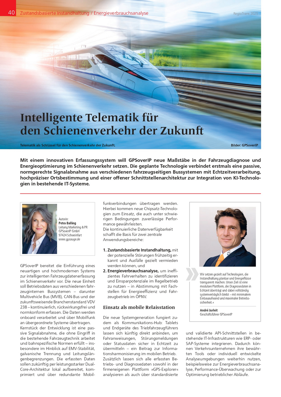 Im aktuellen RegioTrans Jahresmagazin, veröffentlicht vom Kuhn Fachverlag, zeigen wir, wie moderne Telematiklösungen den Schienenverkehr effizienter, sicherer und nachhaltiger machen. Mit unserer neuen KI-gestützten Datenerfassungseinheit für Triebfahrzeuge, deren Markteinführung für 2026 geplant ist, setzen wir Standards in Fahrzeugdiagnose, Energieoptimierung und Infrastrukturüberwachung.