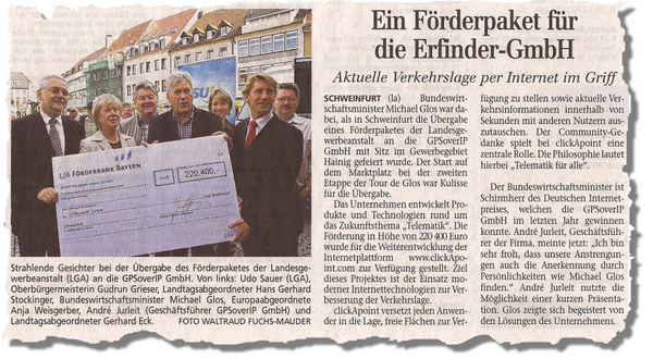 22.08.2008 - Im Beisein von Bundeswirtschaftsminister Michael Glos wurde heute in Schweinfurt die Übergabe eines Förderpaketes der Landesgewerbeanstalt an die GPSoverIP GmbH...