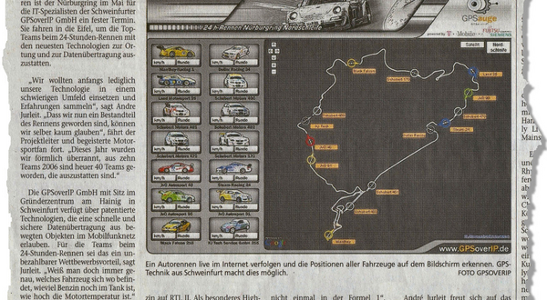 Seit drei Jahren ist der Nürburgring im Mai für die IT-Spezialisten der Schweinfurter GPSoverIP GmbH ein fester Termin. Sie fahren in die Eifel um die Top-Teams beim 24-Stunden Rennen mit der ...
