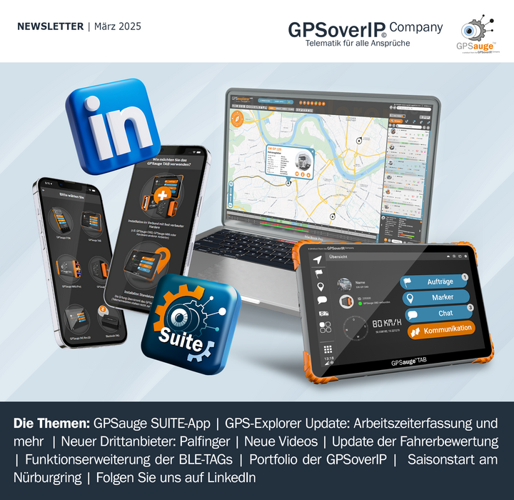 Mit unserem ersten großen Newsletter in diesem Jahr informieren wir Sie über aktuelle Entwicklungen bei GPSoverIP. Erfahren Sie mehr über das neueste Update des GPS Explorers, die erweiterten Funktionen der SUITE App, neue Videos auf unserem YouTube-Kanal, unsere Präsenz auf LinkedIn sowie den Saisonstart am Nürburgring. Zudem erhalten Sie einen Überblick über unser gesamtes Produktportfolio. Bleiben Sie vernetzt und entdecken Sie, was es Neues gibt!